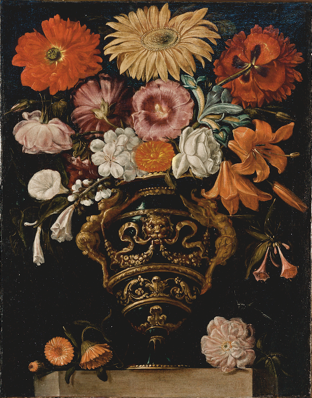 Anche i Fiori in un vaso con arpie e mascherone leonino della Collezione Cerruti sono stati riferiti in un primo momento a Giovanni da Udine5, per poi essere riconosciuti come opera di un maestro romano di primo Seicento. Nella tela risulta particolarmente significativa l’attenzione nella resa degli effetti di luce tanto sulle corolle dei fiori, quanto sul metallo del loro contenitore, la cui scultorea monumentalità viene esaltata dalla ripresa dal basso verso l’alto dell’intera composizione. Nei Fiori in un vaso con rana sul basamento colpisce invece la studiata presenza dell’anfibio, che rafforza il tema della vanitas, già implicito nell’effimera bellezza dei fiori recisi.